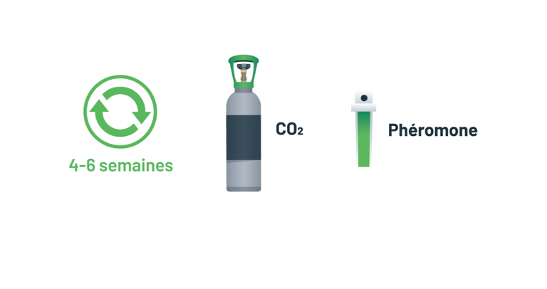 Nos dispositifs imitent la respiration et l’odeur de la peau humaine en émettant une petite quantité de CO2 d’origine biologique ainsi qu’un arôme attractif. Ces consommables doivent être remplacés toutes les 4 à 6 semaines afin de conserver l’efficacité du piège.