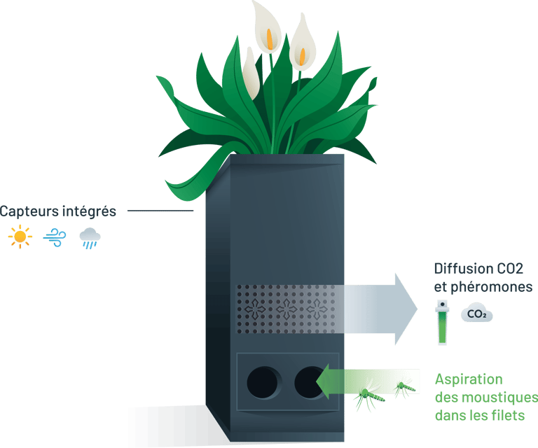 Le piège attire les moustiques en imitant la respiration humaine et l’odeur de la peau. Les moustiques sont ensuite aspirés par les 2 entrées latérales puis capturés dans des filets.